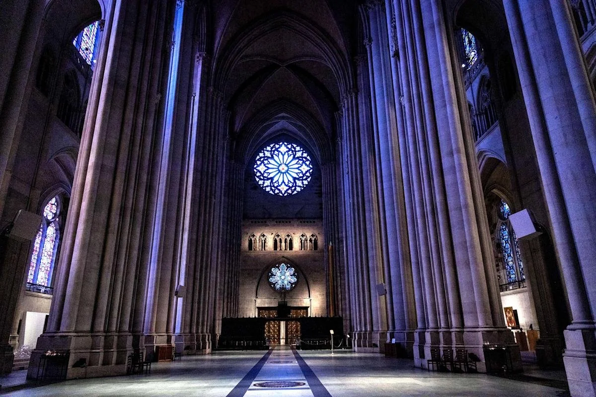 “The sun had set with winter abruptness, and its rays no longer came through the windows; the brilliance of stained glass was eclipsed by night. The columns were more somber, now, as though the whole Cathedral were settling itself to bear the burden of the dark.”